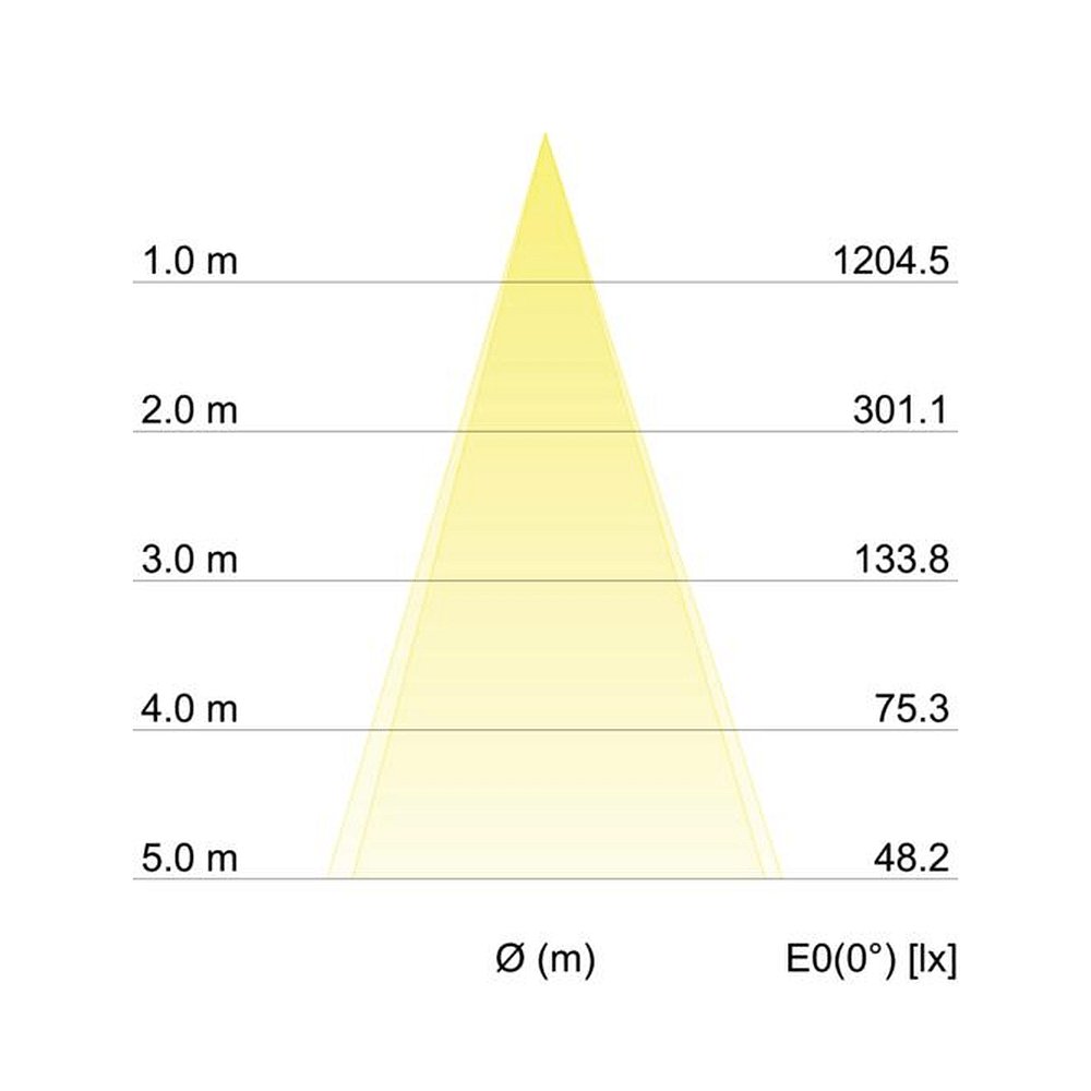 The spotlight operates with a power consumption of 6 watts and delivers a luminous flux of 420 lumens with a luminous efficacy of 70 lm/W. The color temperature is continuously adjustable from 1800 to 3000 Kelvin, which, thanks to the Dim-to-Warm function, means that the light color becomes warmer and cozier when dimmed. With a beam angle of 36°, the luminaire provides a clear, focused beam of light, ideal for accents and atmospheric lighting.
