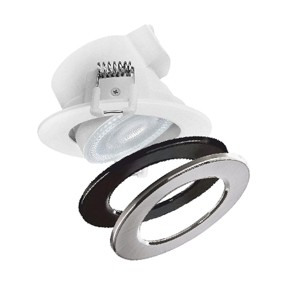 Thanks to the tool-free wiring with a protected connection terminal including through-wiring, the installation of the recessed spotlight is particularly easy. Furthermore, the spotlight comes with 3 interchangeable snap-on covers that allow for individual customization.