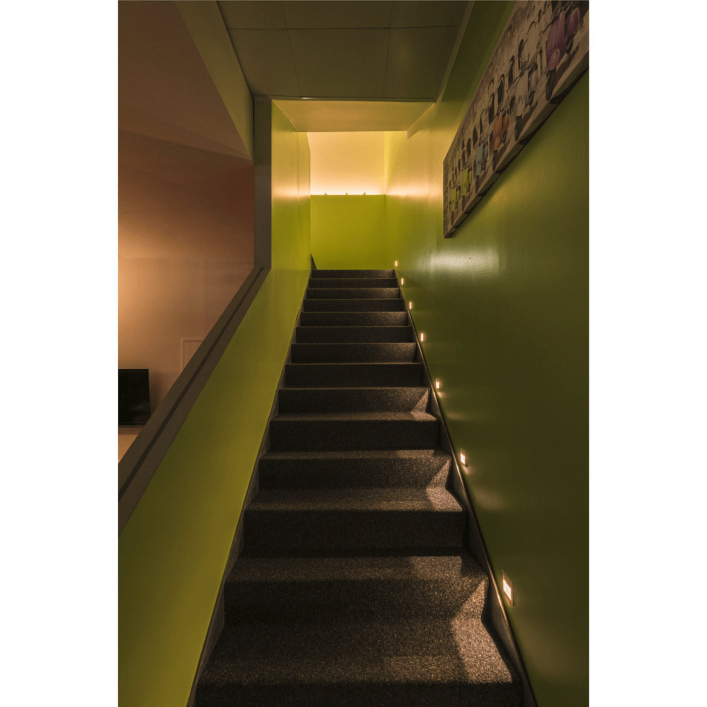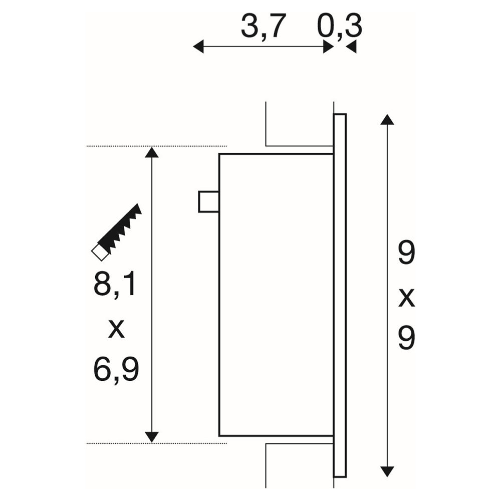 The square shape of the light measures 9x9x4 cm, making it perfect for mounting on the wall. The installation depth is 4.2 cm and the installation opening has a rectangular length of 8.1 cm and a width of 6.9 cm. The aluminum material not only provides a high-quality appearance, but also durability.