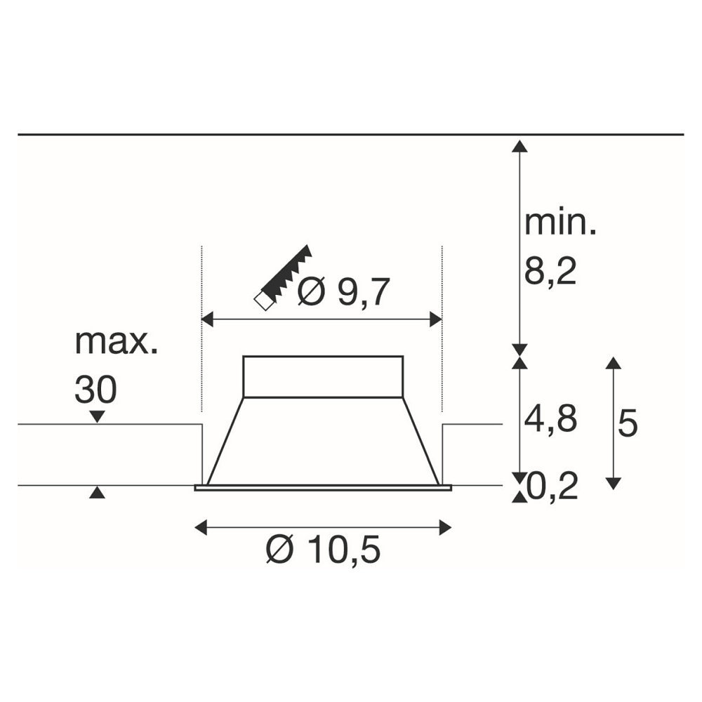 The recessed light has a size of Ø 10.6 / H 16.5 cm and an installation depth of 16.5 cm. The installation opening is 10 cm in diameter. The light has a swivel range of 20° and a narrow, inconspicuous collar.