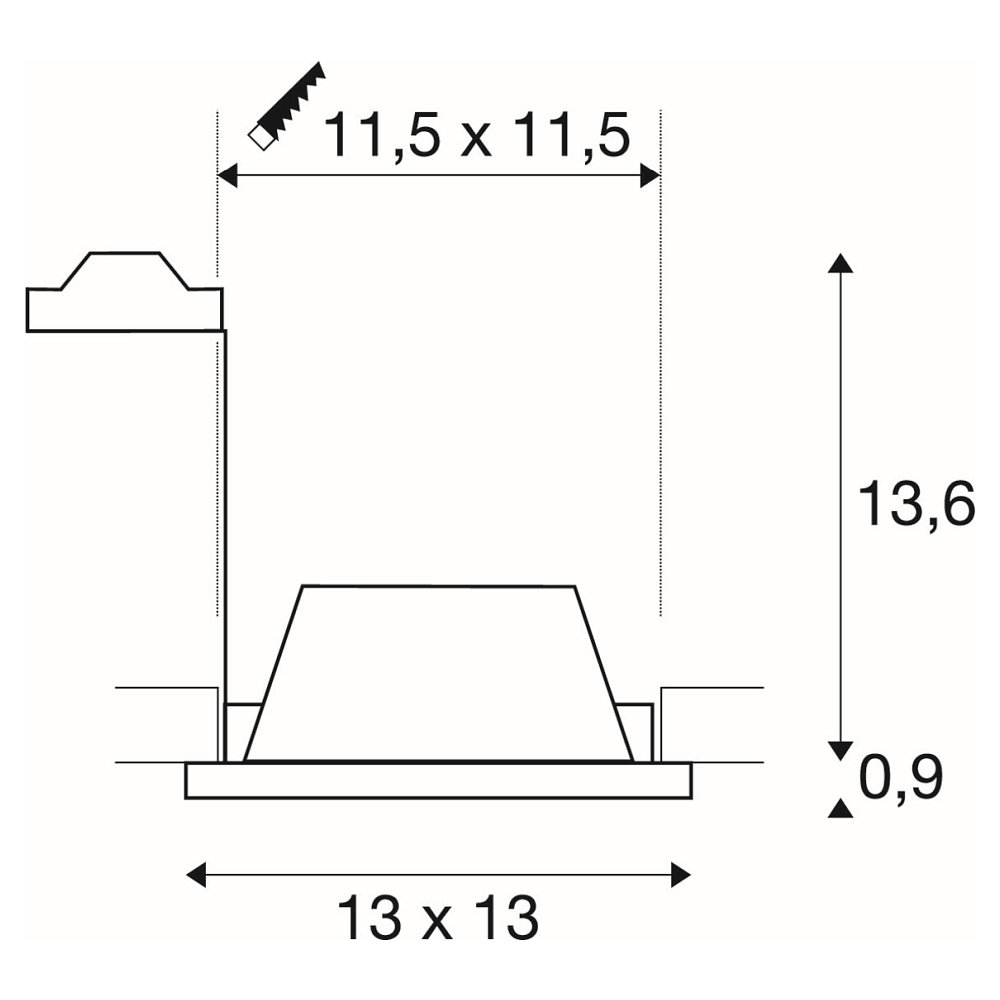The installation depth is 14 cm, and the installation opening is 11.5 x 11.5 cm. The PLASTRA Downlight plaster recessed light has an operating voltage of 230V and a socket designation of GU10 for the light source. It is designed for light sources with a maximum power consumption of 35W and can be operated with a QPAR51 light source or optionally with LED.