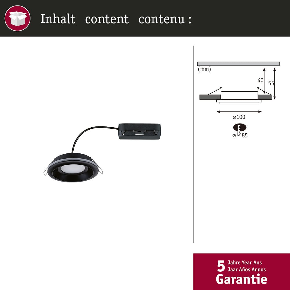 The LED recessed light SORMUS from Paulmann is a high-quality single spotlight with a beam angle of 100°. With a power consumption of only 6.5W, it is equivalent to a conventional incandescent bulb with a power of 29W. The color temperature is 3000K and the color rendering index is over 80Ra.