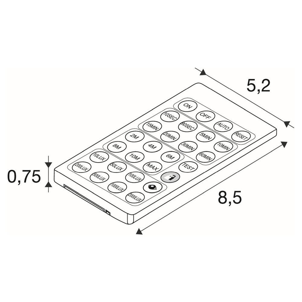 The remote control for sensor programming from SLV is specially designed for the BATTEN P light strips with an integrated PIR sensor. It enables simple and comfortable control of the lighting functions without complicated on-site settings. With a compact design of 8.5 x 5.2 x 0.6 cm, the remote control fits comfortably in the hand and offers practical operation of all important sensor functions.
