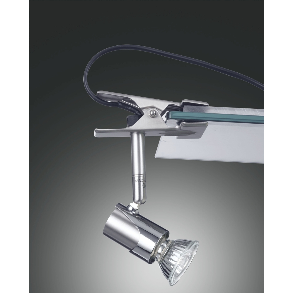 Die Klemmleuchte wird ohne Leuchtmittel geliefert. Der Sockelbezeichnung des Leuchtmittels ist GU10. Es handelt sich um einen Topseller Halogenspot nickel/Chrom Dekor. Ersatzteile für das Leuchtmittel sind auf Anfrage erhältlich. Die Leuchte verfügt über einen Schalter für die einfache Bedienung.