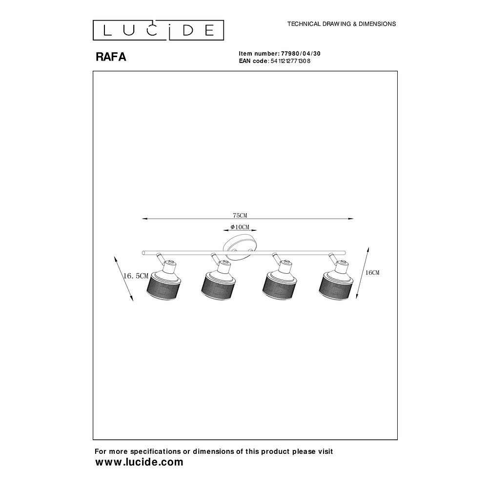 The dimensions of the ceiling spotlight RAFA are 74x15x17 cm (length x width x height) and it has a shade with dimensions of 9x9x7 cm. The canopy has a diameter of 10 cm and a height of 2.5 cm. The operating voltage is 230V and the protection class is 1. It is suitable for indoor use and has an IP protection rating of IP20.