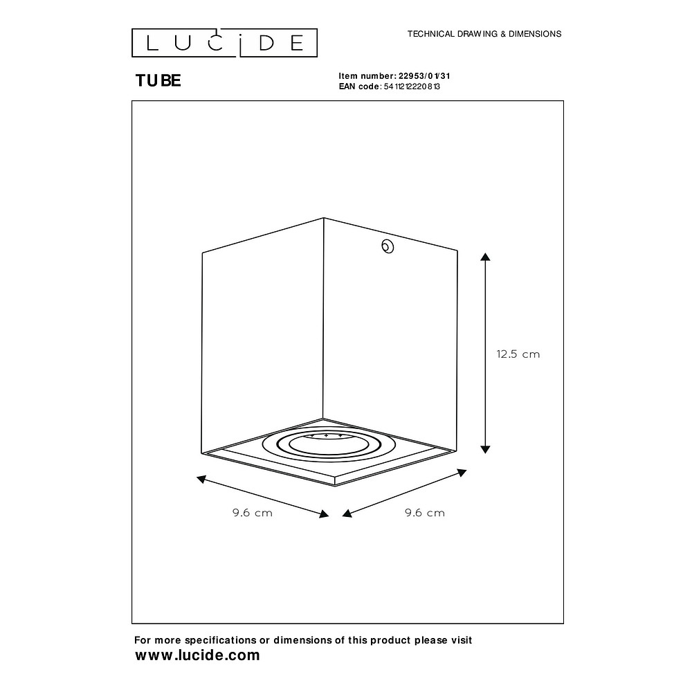 The ceiling spotlight TUBE is a modern and elegant lighting element for your home. With dimensions of 9.6 x 9.6 x 12.5 cm, this square spotlight fits perfectly in any room and provides pleasant illumination.