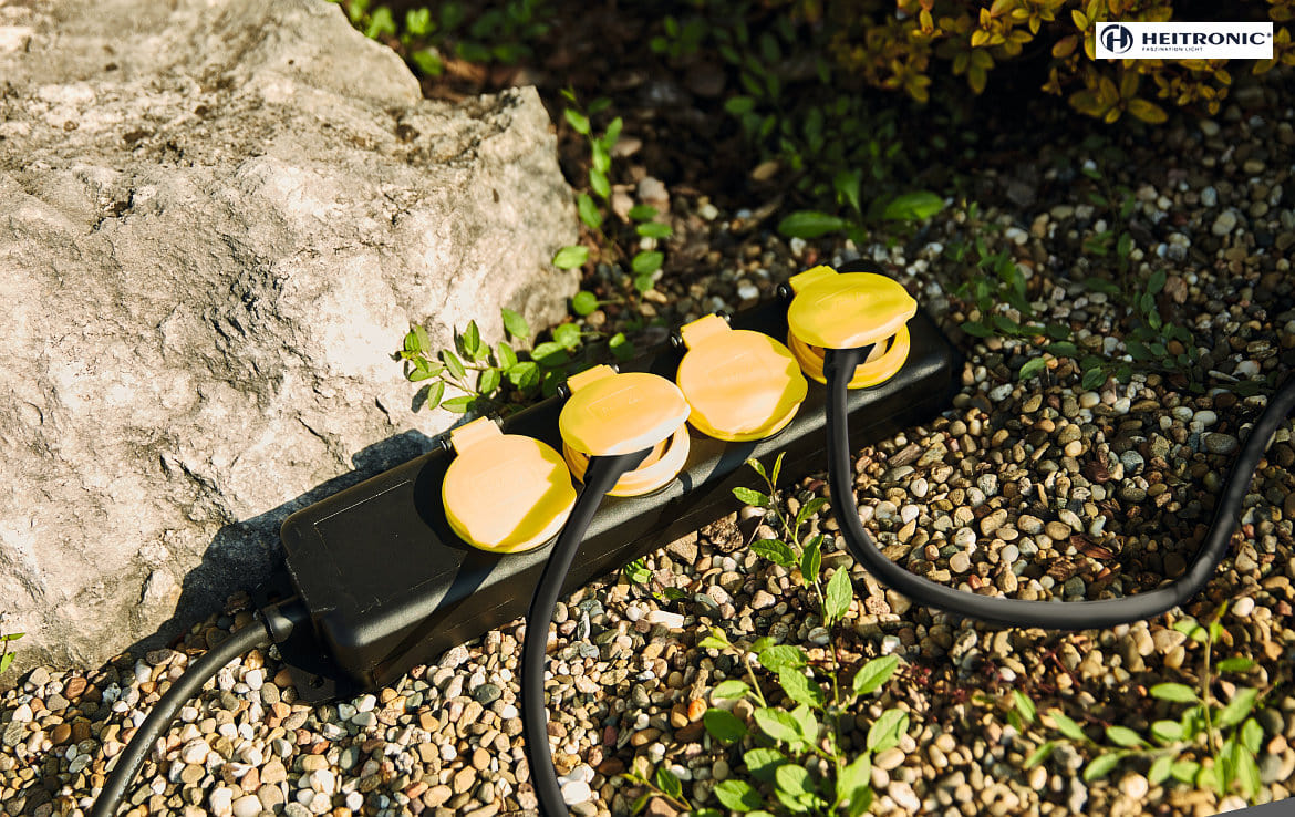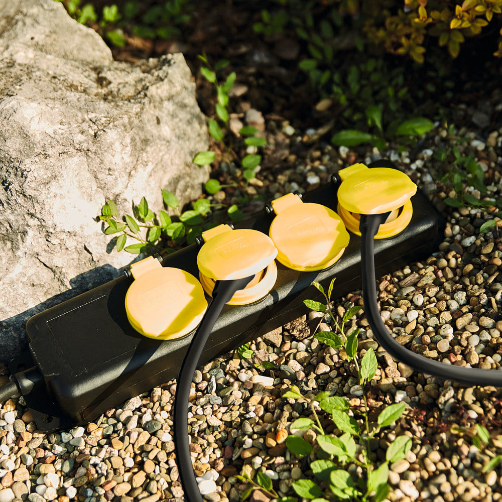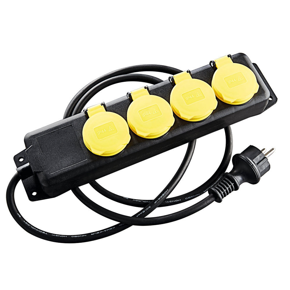 Steckdosenleiste, IP44, mit 150cm Anschlusskabel + Federklappdeckeln, schwarz / gelb, 4-fach