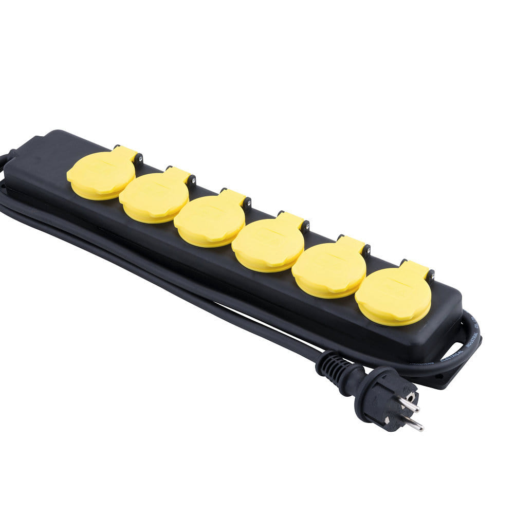 Steckdosenleiste, IP44, mit 150cm Anschlusskabel + Federklappdeckeln, schwarz / gelb, 6-fach