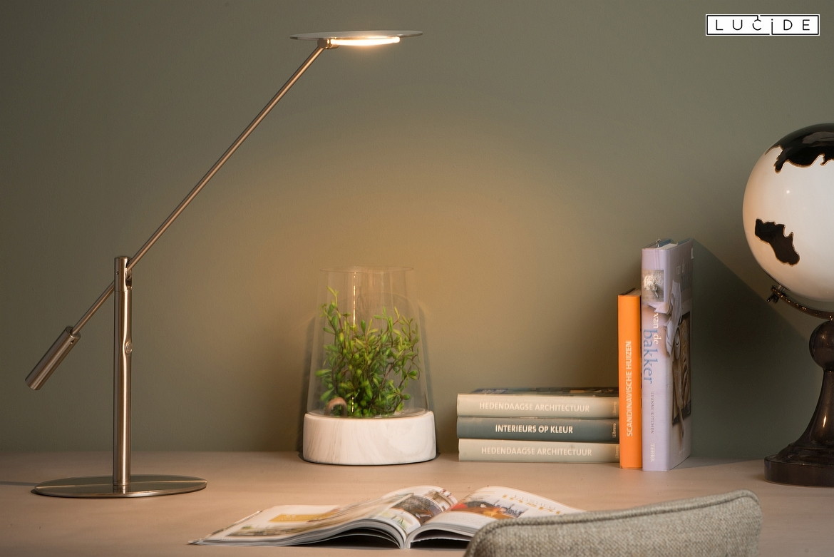 The LED desk lamp ANSELMO includes the light source. It is operated with an adapter/power supply. The chrome matte color gives it a modern look that fits any desk style. Perfect for use on your desk at home or in the office.