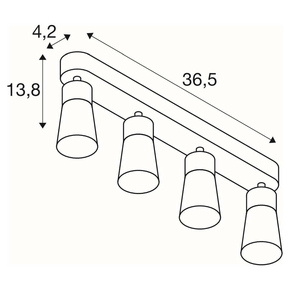 The PURI 2.0 CONE light has 4 GU10 sockets, in which bulbs with a maximum power of 6W can be inserted. The light distribution is direct, allowing for targeted illumination. With dimensions of 36.5 x 5.5 x 13.8 cm and a weight of 0.65 kg, the light is compact and easy to mount.