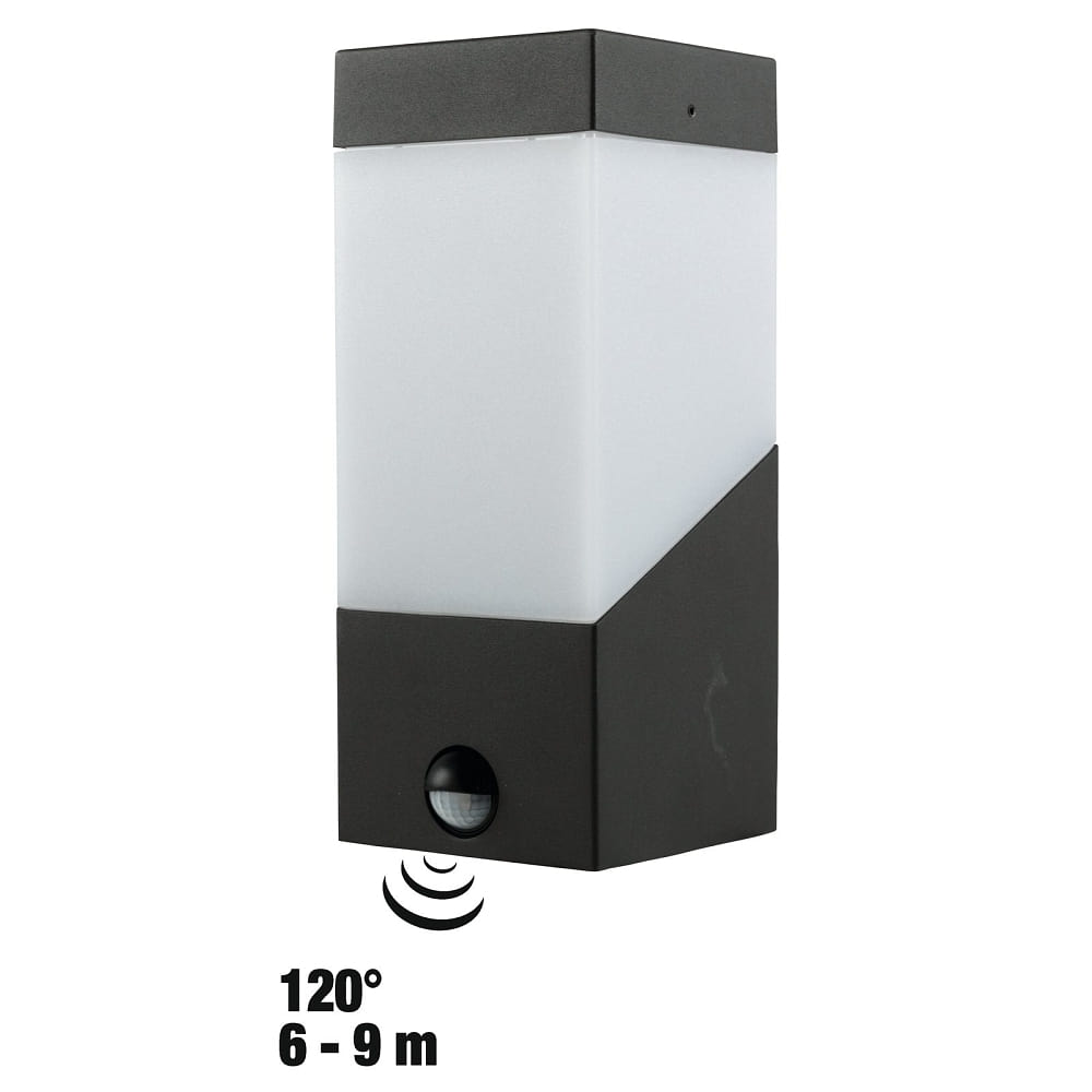 The outdoor wall light MADELEINE has dimensions of 10 x 24.3 x 11.5 cm and weighs 1.1 kg. It operates at a voltage of 230V~ and has an E27 socket. With a detection angle of 120 degrees and a range of 6-9 meters, it provides effective illumination in outdoor areas.