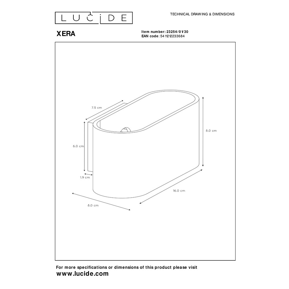 The wall light XERA is an elegant lighting element for indoor use. With an operating voltage of 230V and a size of 16 x 8 x 8 cm, it is perfect for wall mounting.