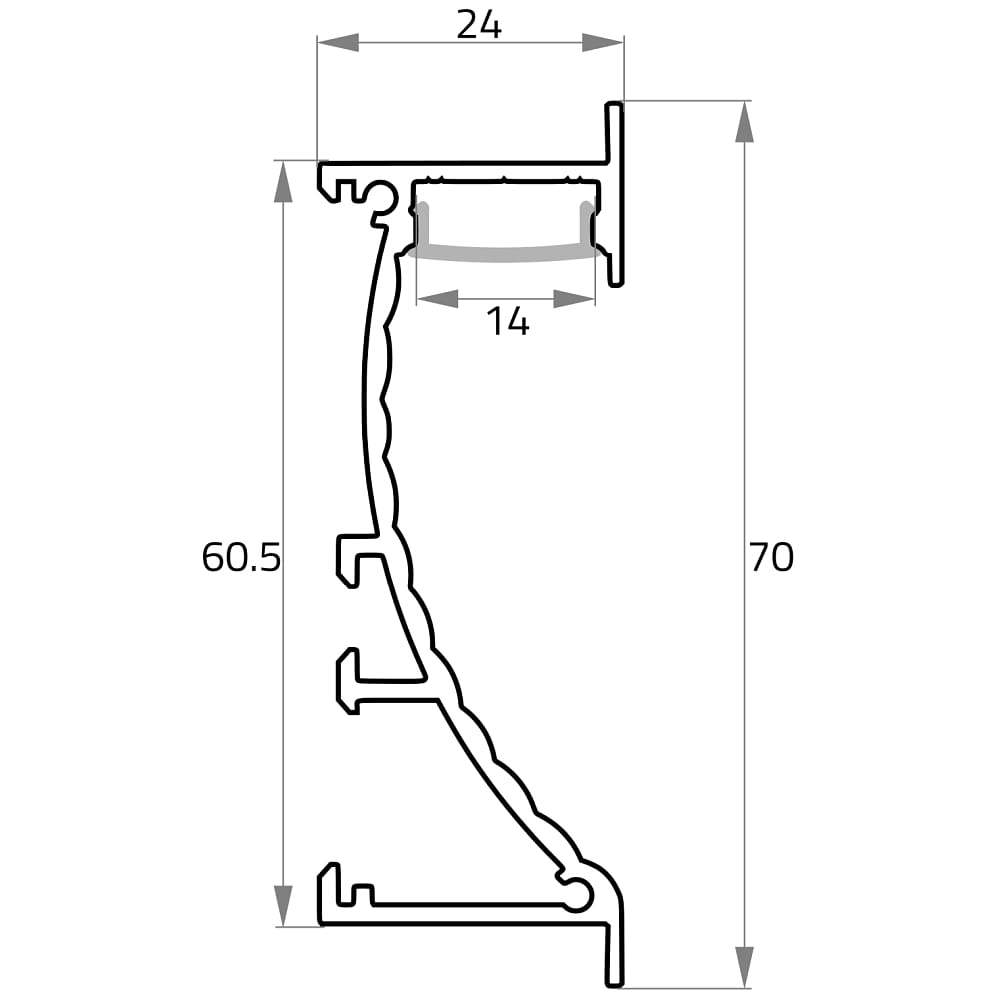 The wall profile measures 200 x 2.4 x 7 cm (length x width x height) and accommodates LED strips up to a width of 12.2 mm. The rippled reflector provides effective indirect lighting.