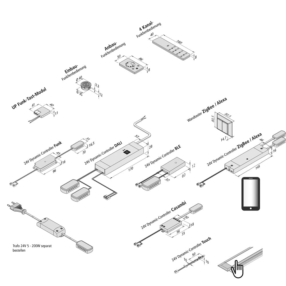 Im Lieferumfang enthalten sind neben dem Wandtaster auch der Controller mit 96 Watt Leistung und ein 6-fach Verteiler. Der Controller arbeitet mit einer sicheren 24V Niedervolt-Spannung und verfügt über einen integrierten Lichtwert-Speicher, der die Einstellungen zuverlässig speichert. Das Zubehörpaket macht die Installation und den Betrieb besonders komfortabel, während das DYNAMIC 24V Stecksystem für eine einfache Verbindung sorgt.